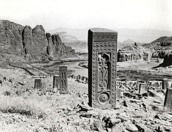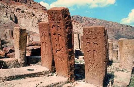 The Armenian cemetery in Julfa was a cemetery near the town of Julfa (known as Jugha in Armenian), in the Nakhchivan exclave of Azerbaijan that originally housed around 10,000 funerary monuments. The tombstones consisted mainly of thousands of khachkars, uniquely decorated cross-stones characteristic of medieval Christian Armenian art. The cemetery was still standing in the late 1990s, when the government of Azerbaijan began a systematic campaign to destroy the monuments. After studying and comparing satellite photos of Julfa taken in 2003 and 2009, in December 2010 the American Association for the Advancement of Science came to the conclusion that the cemetery was demolished and leveled.