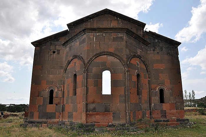 Some architectural details of Talin are similar to that of Zvartnots Temple which gave ground to suppose that the Talin Cathedral is a contemporary construction with Zvartnots Temple dating back to the 7th century. The big temple of Talin is a unique monument of Armenian Church architecture and belongs to a three-nave vaulted type of basilicas. Its prototype in the beginning of VII c is the reconstructed Dvin's St. Gregory temple, which from three-nave basilica turned into a three-bayed temple. That was achieved by adding bays into the longitudinal walls, which were half-rounded from inside and polyhedral from outside. This new idea of foundation, improved in Talin's temple, became a complete, independent and the unique example of early medieval church type.