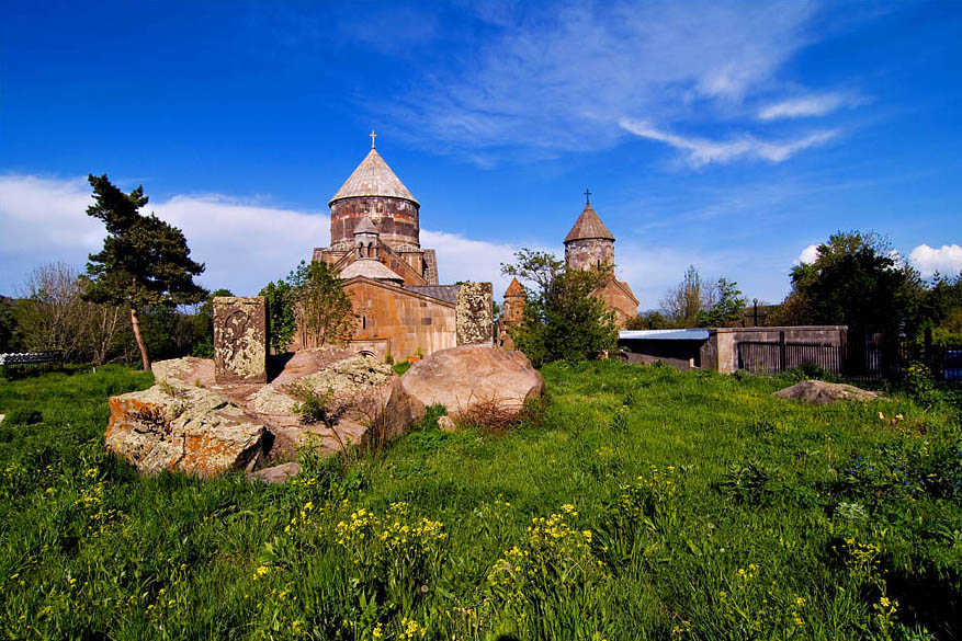 Kecharis Monastery (11th-13th century) is located in Tsakhkadzor ski resort in Kotayk Region. The monastery was founded by Pahlavuni Prince to become a major religious and educational center of Armenia. Kecharis has undergone a major reconstruction and it is seen from the ski slopes. The main group of the complex consists of three churches, two chapels and a gavit, to the west of which, a few dozen meters away, there is another church with its own vestry at the side of a road leading to the forest. There still are many tombstones around these monuments. The main temple of Saint Grigor was erected by Grigor Magistros Pahlavuni (an Armenian Prince, linguist, scholar) in 1003. The church has an architecture typical of the feudalism period in Armenia. The interior of the temple is divided into three spaces by two pairs of wall-attached abutments. The central (and largest) space of the church is crowned by a broad cupola resting on spherical pendentives.
